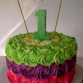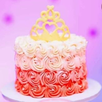 It’s a fantastic Rosette fudge Cake brings a garden of Roses, delicious roses to the Party table, it’s covered by pink shaded Butter Icing, and gold fondant crown on the top.