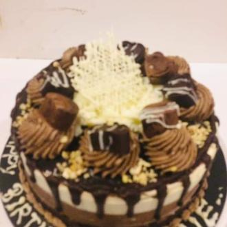 It’s a delicious moist Chocolate sponge cake, filled and coated with a coco butter cream and Perfectly dripped with a dark chocolate ganache, topped off with Chocolates,nuts and Rosette piping