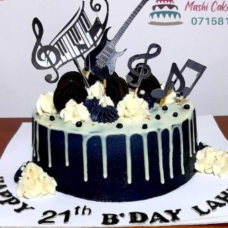 Indulge in our decadent butter cake adorned with vibrant blue buttercream frosting. Delightful 2D musical notes, guitars, and pianos crafted from sugar add a whimsical touch. A drizzle of luscious white chocolate, intricate sugar paste piping, and edible stones elevate this creation to a symphony of flavor and visual delight. Experience blissful sweetness with every bite.